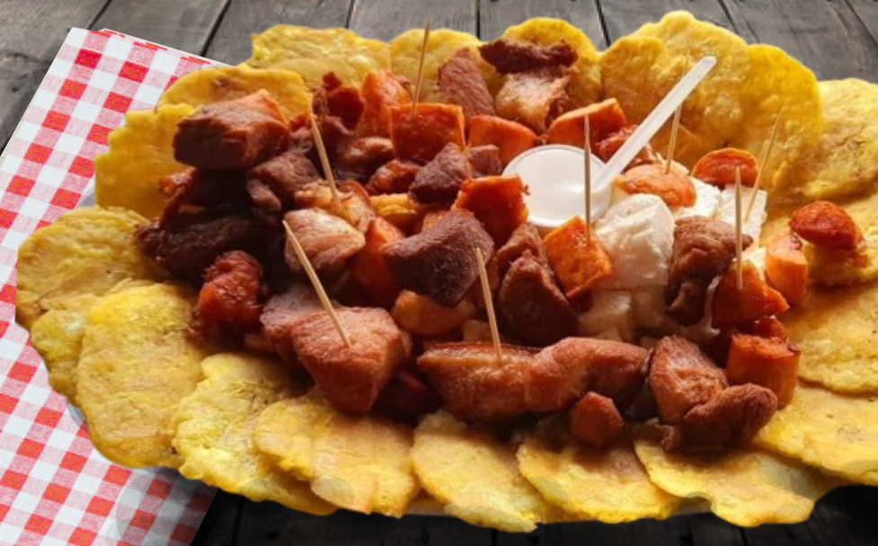 Patacones, yuca, chicharrones, chorizo, queso, suero