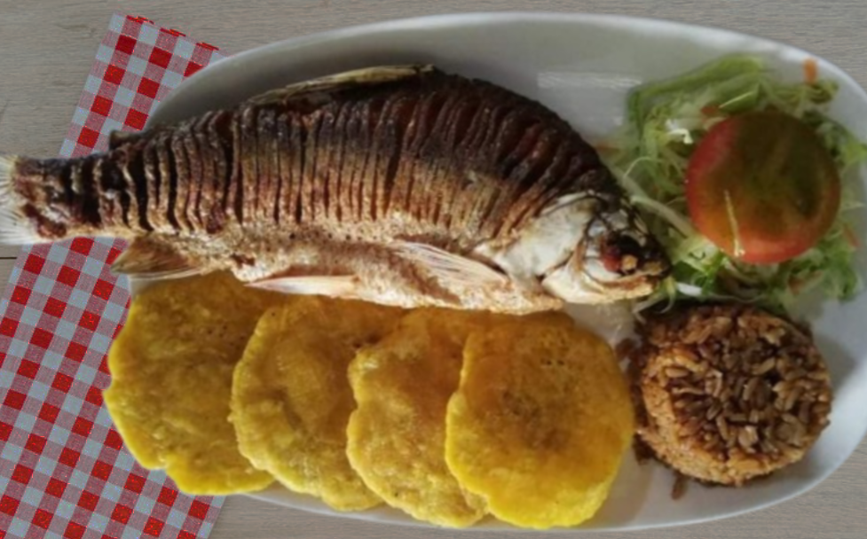 Bandeja con cachama, patacones, arroz con coco, ensalada verde y jugo de temporada.