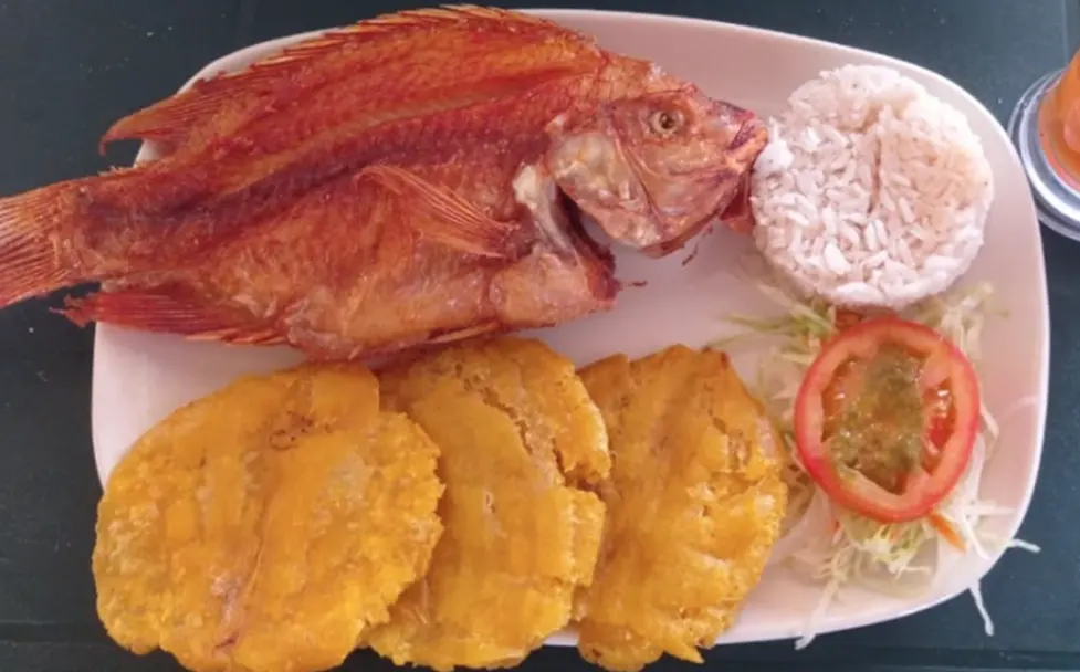 Bandeja con tilapia, patacones, arroz con coco, ensalada verde y jugo de temporada.
