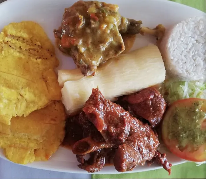 Plato de sopa, bandeja con 2 presas de gallina, yuca, patacón, arroz con coco, ensalada verde y jugo de temporada.