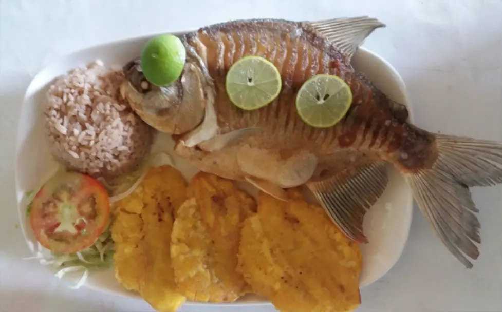 Bandeja con tilapia, patacones, arroz con coco, ensalada verde y jugo de temporada.