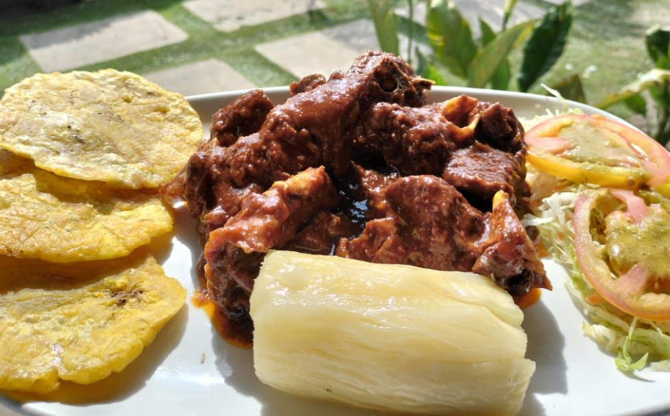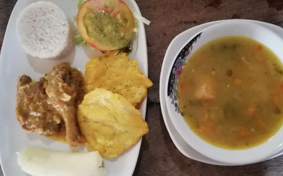 Plato de sopa, bandeja con 2 presas de gallina, yuca, patacón, arroz con coco, ensalada verde y jugo de temporada.