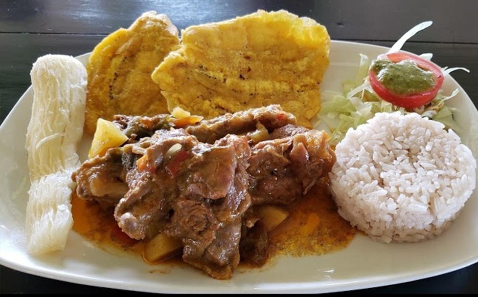 Presa de pato, porción de carnero, arroz, patacones, yuca, ensalada y jugo de temporada.