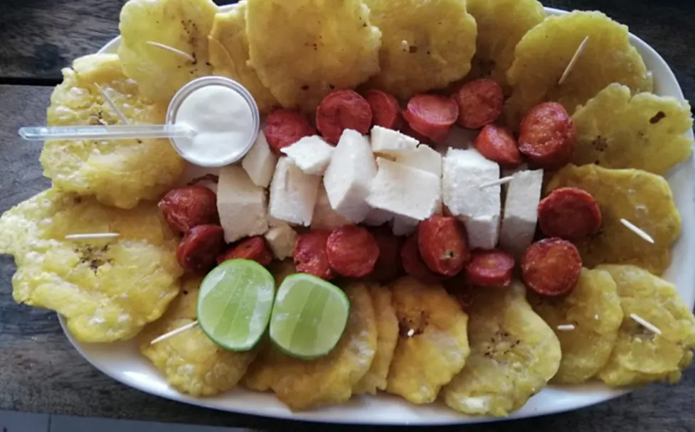 Patacones, yuca, chicharrones, chorizo, queso, suero